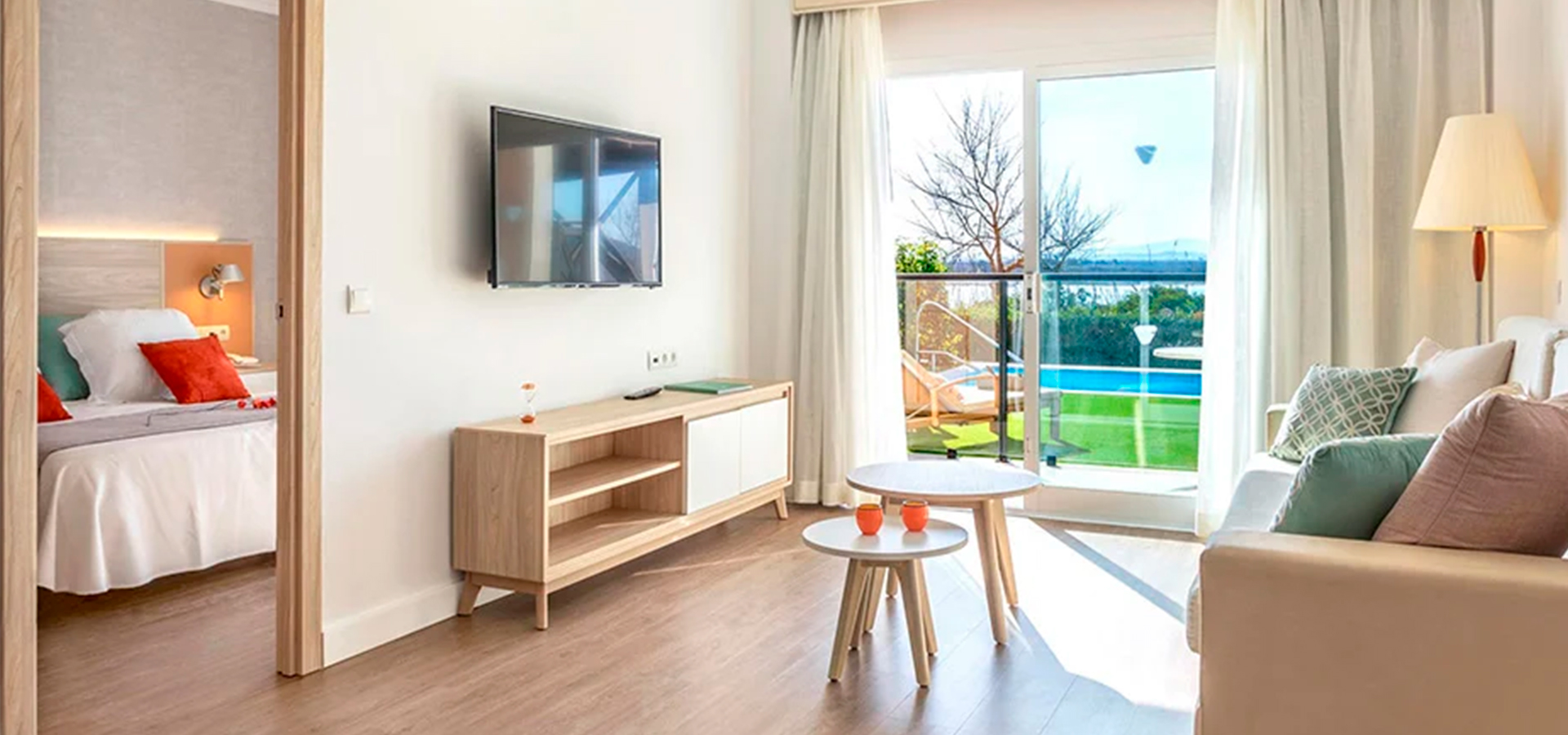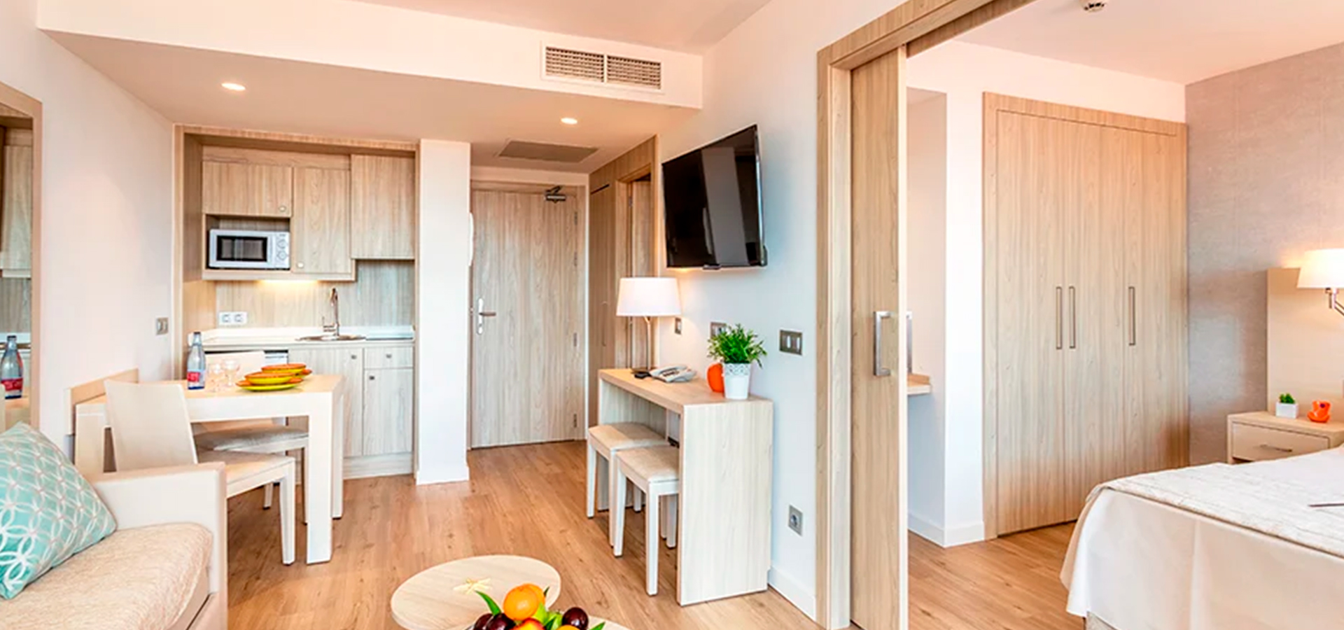 Der entscheidende Unterschied liegt nicht in der Quadratmeterzahl, sondern in der Aufteilung. In einem familienfreundlichen Aparthotel auf Mallorca gibt es eine räumliche Trennung (eine Trennwand oder eine Schiebetür) zwischen Schlafzimmer und Wohnzimmer. Im Wohnzimmer befindet sich ein bequemes Sofa. So entstehen zwei verschiedene Bereiche. Wenn die Kinder schlafen, können die Erwachsenen weiterhin ihren Abend genießen.