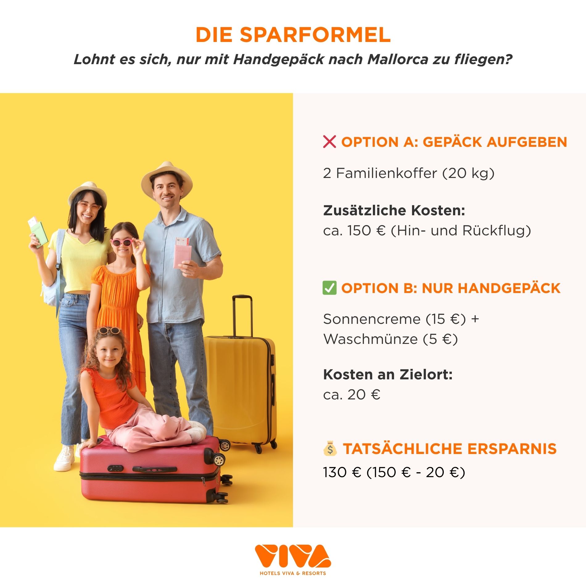 Mit dem erweiterten Handgepäcktarif (ein Handgepäckstück von 10 kg pro Passagier + ein kleiner Rucksack unter dem Sitz) zu reisen, kostet in der Regel etwa 15–20 € pro Strecke/Flug. Abgesehen vom Flugticket entstehen durch das Nicht-Aufgeben von Gepäck am Zielort zwei zusätzliche Kosten: der Kauf von größeren Mengen an Flüssigkeiten (wie Sonnencreme für die ganze Familie) bei der Ankunft auf Mallorca und die Nutzung einer Waschmaschine im Laufe der Woche.