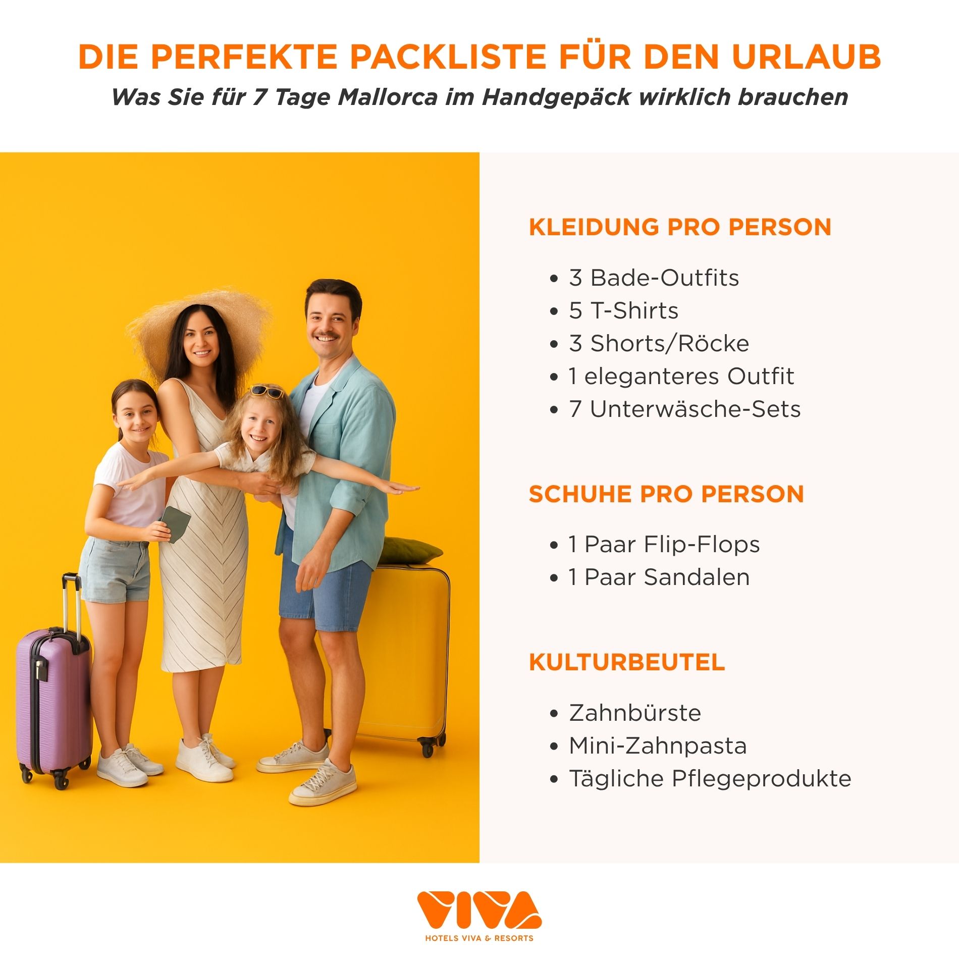 Bei Hotels VIVA kennen wir die Bedürfnisse von Familien sehr genau. Unser Ansatz basiert auf der 80/20-Regel: In der Hochsaison auf den Balearen verbringen Kinder etwa 80 % ihrer Zeit in Badebekleidung – entweder am Strand oder in unseren Pools. Zu viel Kleidung „für alle Fälle“ oder schwere warme Kleidung mitzunehmen, ist einer der häufigsten und teuersten Planungsfehler im Urlaub.