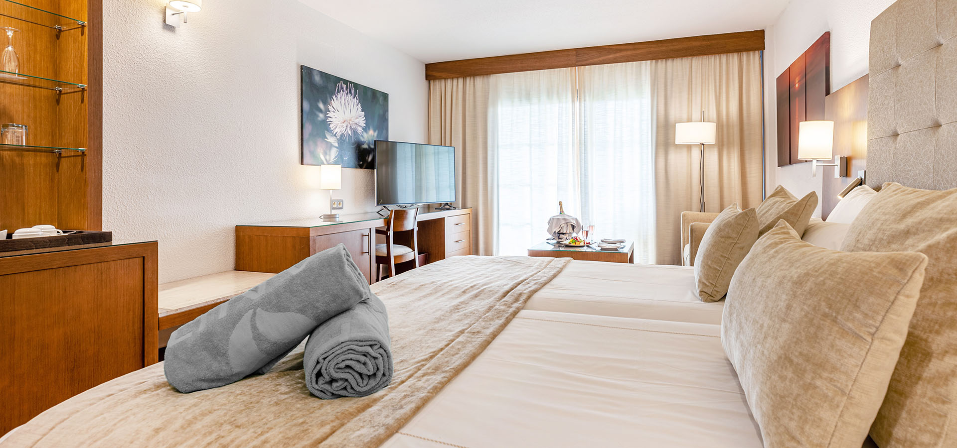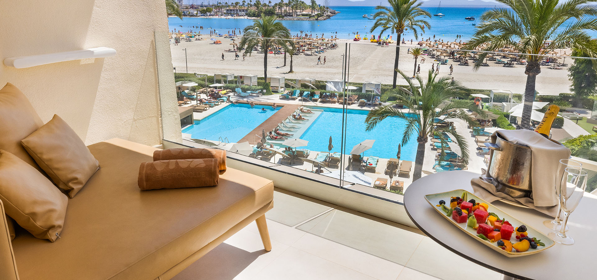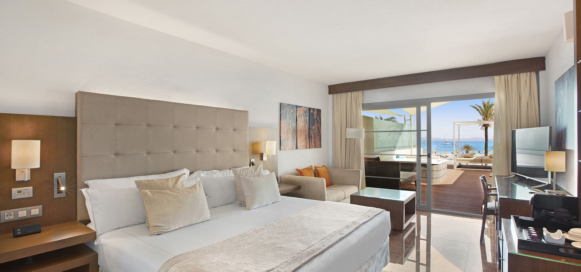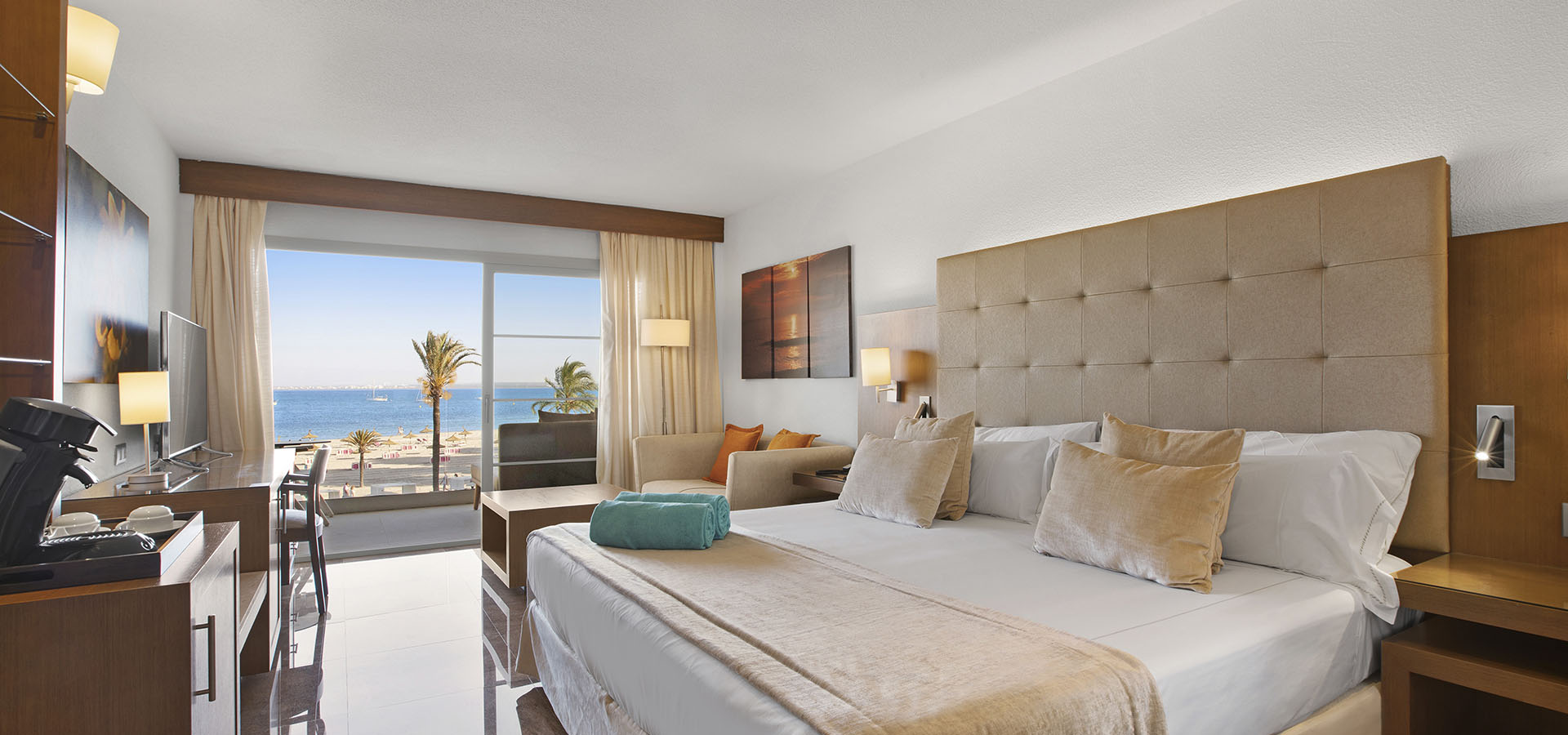 Harmony. That's what you'll feel in this room. And a great deal of peace. The colour palette that dominates its design and views of one of Majorca's most stunning beaches will make you feel heavenly. Enjoy all the benefits of our Selection Club in a really superior room.