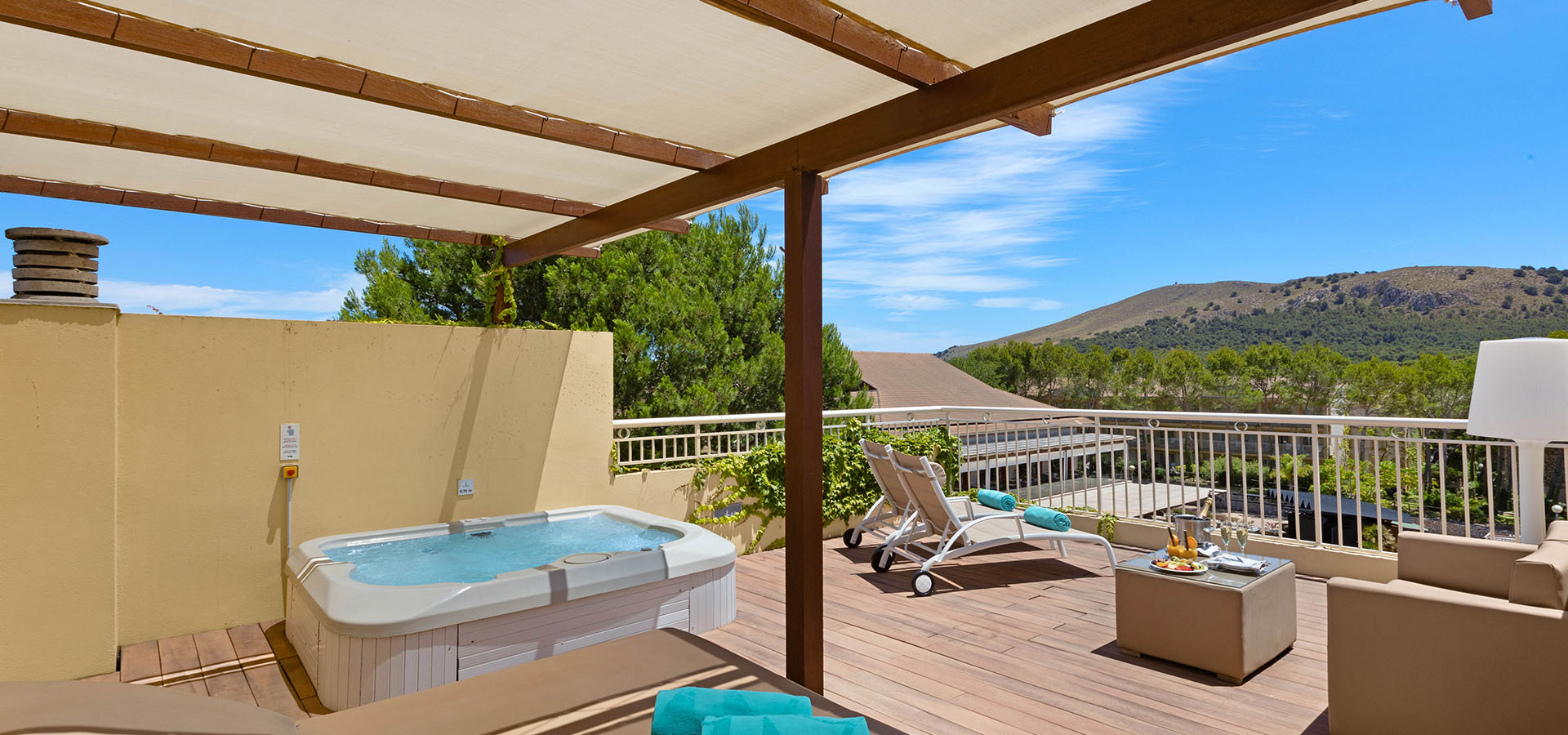 Nuestra Royal Terrace es la joya de la corona, un espacio diseñado para ofrecerte el máximo confort y lujo. Disfruta de una terraza exclusiva equipada con una mini piscina con hidromasaje para dos personas, una cama balinesa, hamacas y una acogedora zona de asiento.