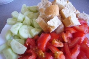 Se trata de una sopa fría elaborada con: aceite de oliva, vinagre, tomate, pimiento, cebolla, pan, ajo y pepino (este último es opcional, algunos prescinden de él en sus recetas).