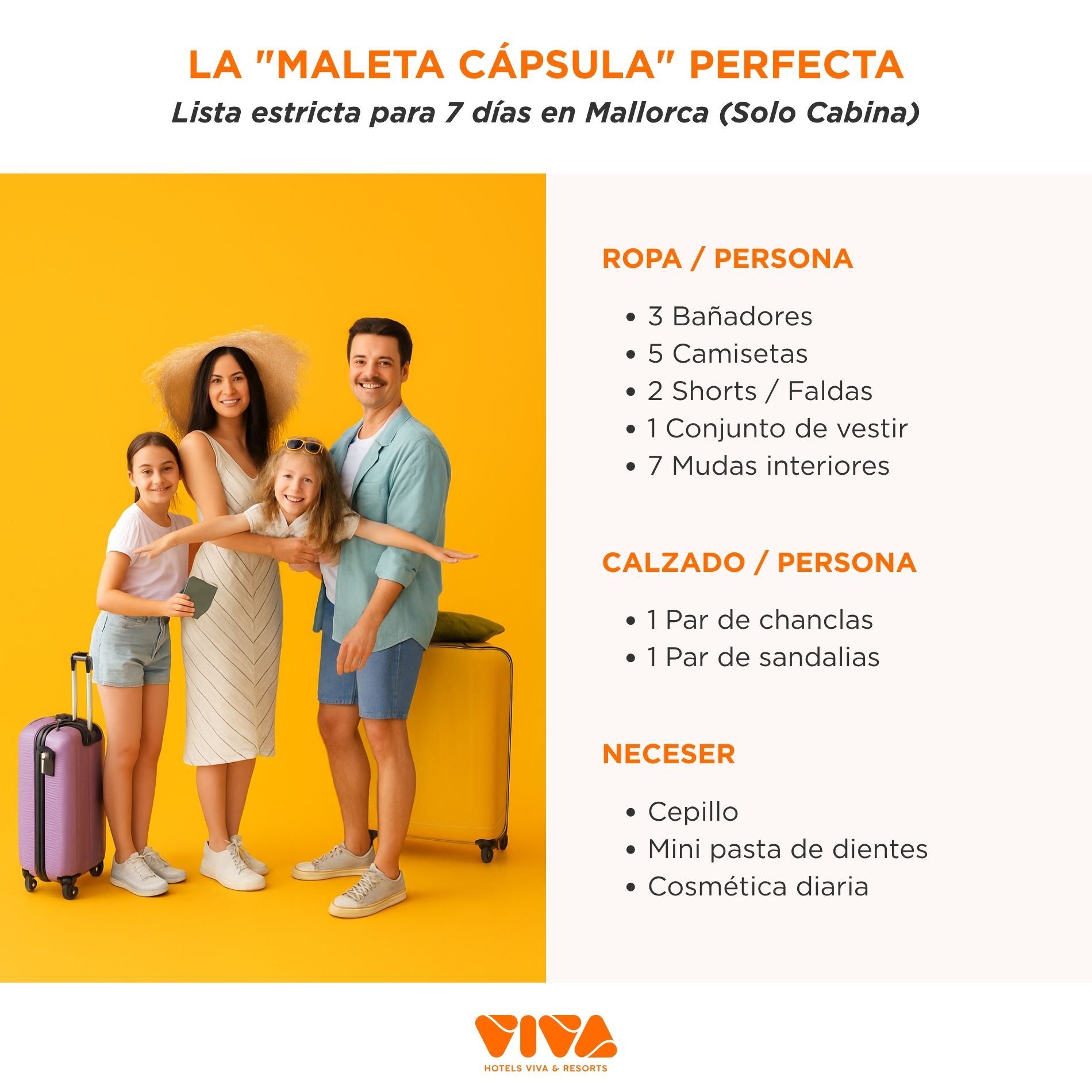 En Hotels VIVA conocemos perfectamente la logística familiar. Nuestra tesis logística se basa en la Regla del 80/20: en pleno verano balear, los niños pasan el 80% de su tiempo útil en bañador, ya sea en la playa o en nuestras piscinas. Llevar ropa de más, "por si acaso" y prendas de abrigo pesadas es el error de planificación más caro que puedes cometer.