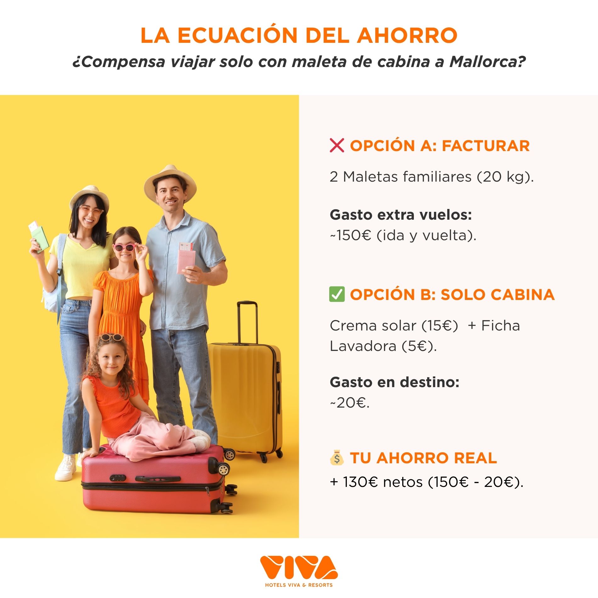 Aplicando esta guía matemática y de empaquetado, viajar a Mallorca con tu familia solo con maletas de cabina no solo es posible, sino que es la decisión más inteligente. Reduce el estrés en el aeropuerto (al no tener que esperar en las cintas de recogida de equipajes), abarata los costes del billete y te permite iniciar tus vacaciones en el momento en el que pisas el hall de Hotels VIVA.